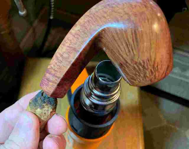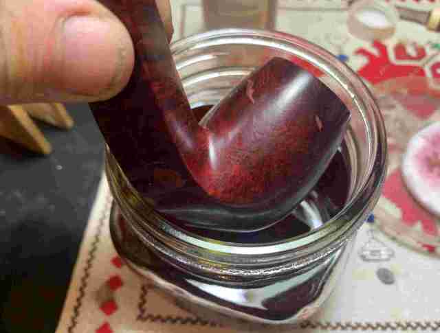 After the unwrapping is completed, the stummel is wiped with a cotton pad wetted with alcohol. Doing this helps to remove excess dye and to blend the new dye over the grain.