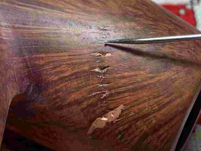 The next morning, with the help of 0000 grade steel wool, the finish is largely removed. Care is given to guard the G.V.G. nomenclature.