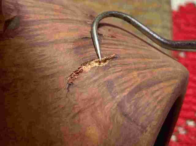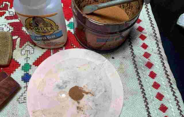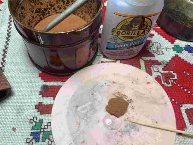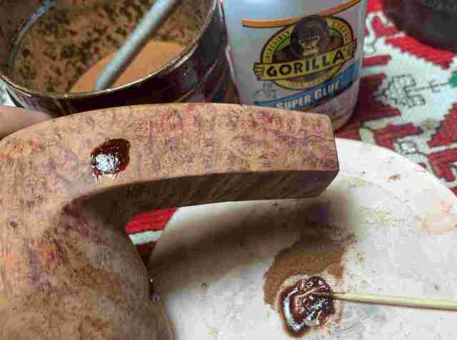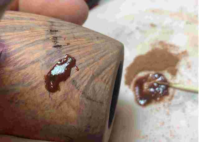 A toothpick draws briar dust into the glue while mixing at the same time. When the mixture reaches the thickness of molasses, it is trowel to the bowl and applied on the pits.