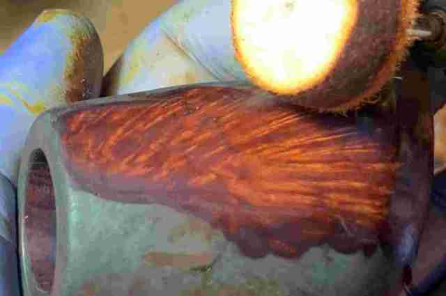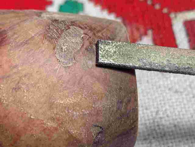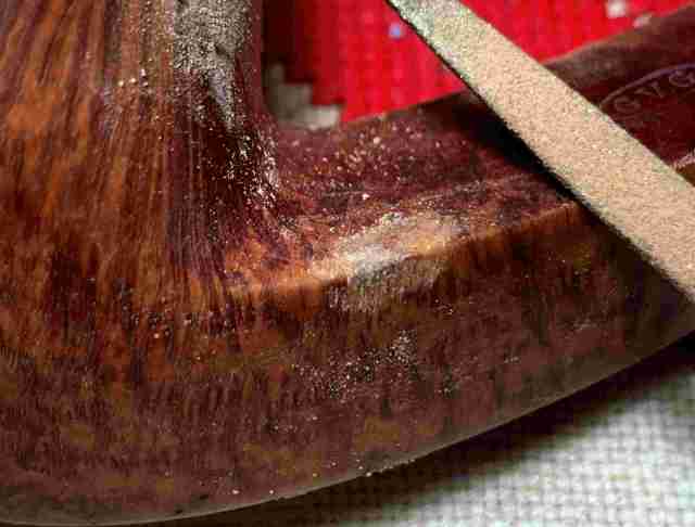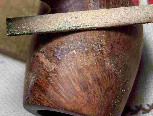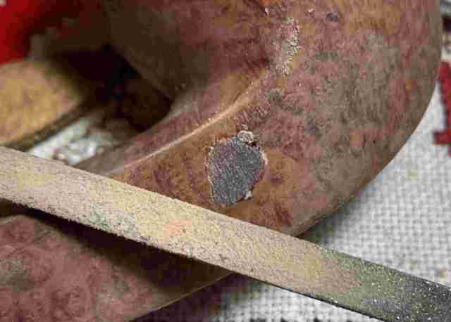 Next, the arduous process begins of filing down all the patches so that they are flush with the briar surface.