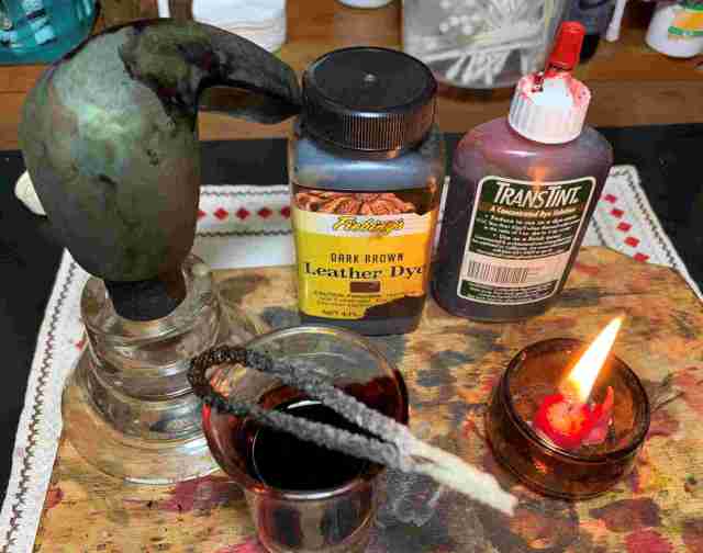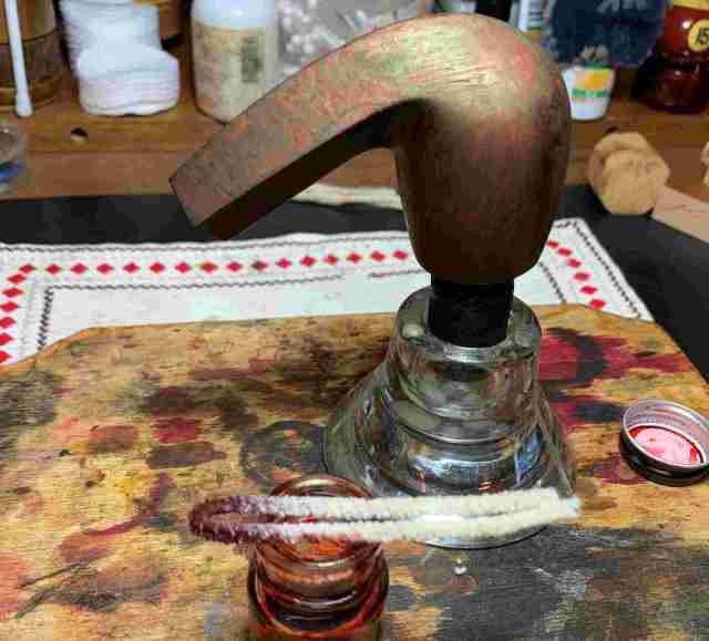 The dye mixture is then applied in sections to the stummel with a folded pipe cleaner then while it is still wet, is then ‘flamed’ using a lit candle. The candle’s flame combusts the alcohol in the aniline dye and leaves behind the dye pigment in the briar.