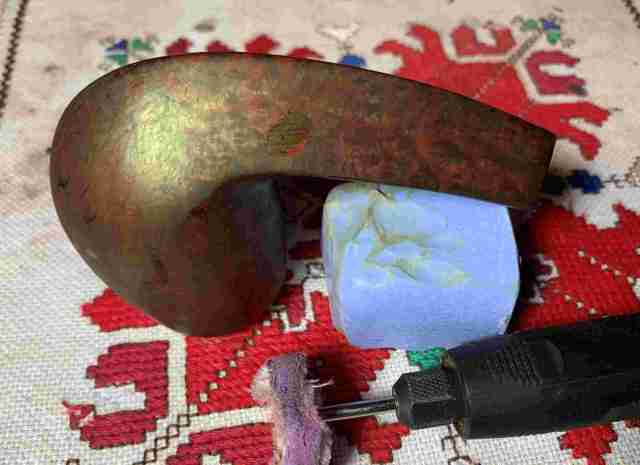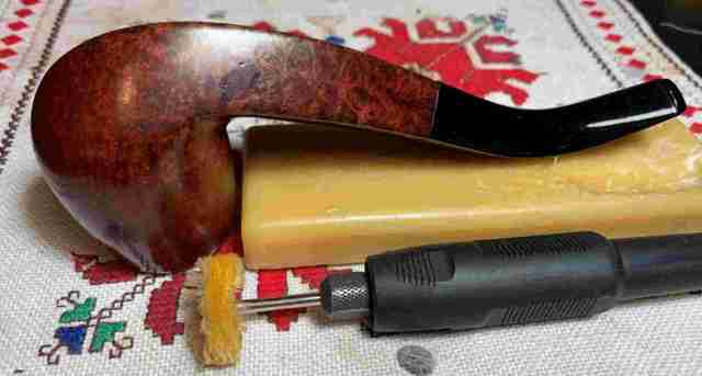 The next day, the time to unwrap the crusted stummel has come. After mounting a felt buffing wheel onto the rotary tool and setting the speed to a slower 35% of full speed or so, the coarser Tripoli compound is applied to unwrap the stummel. The felt wheel is purged often using the edge of the wood lap board I work on with the rotary tool. Purging the felt wheel clears the flamed crusted dye and softens the wheel.