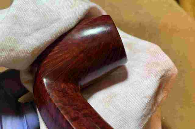 I’m pleased with the results. The reddish hue is distinctive, and the darker undercoat base is providing the grain contrasting. To help prevent leeching of the new dye onto Todd’s fingers after he puts his pipe back into service, the stummel is warmed with the hot air gun and then rigorously hand buffed with a cotton cloth. The heating serves to emulate the heating up of the briar when the pipe is first put into service.