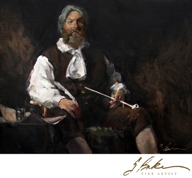 He poses with a tavern pipe. This type of pipe was a communal pipe used in pubs in the 18th century. After each use, the pipe stem was cut away then replaced on the mantel for the next user. I chose a color scheme appropriate to the time period and drew inspiration from Rembrandt’s work in the direct gaze, dark background and loose handling of paint, especially in the clothing….