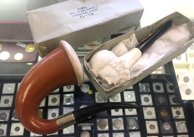I acquired this beautiful Sculpted Sultan Meerschaum on a pipe picking expedition at the Homestead Antique Mall in Arvada, Colorado – a suburb of Denver, last year (2018) when my wife and I were in Denver celebrating Christmas with our family. The expedition was very fruitful with the acquisition of two exquisite pipes – a Gourd Calabash and the Sculpted Meerschaum now on my worktable. The Calabash is still in my inventory and is available to be commissioned! I haven’t had the time to post pictures of it in the online collection, For “Pipe Dreamers” Only! A picture of the fruit of that pipe picking day was taken on the counter at Homestead Antique Mall.