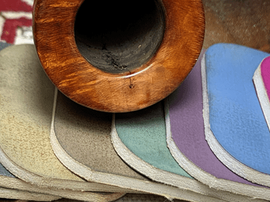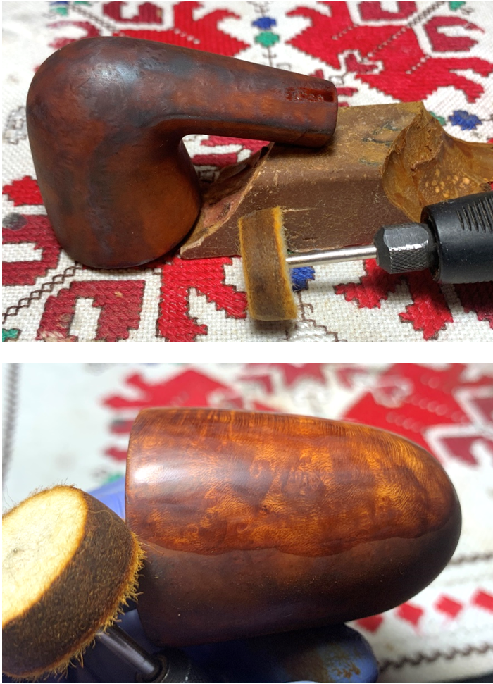 After completing with the Tripoli compound, the bowl is wiped with a cotton pad wetted with alcohol. This further removes excess dye and blends the new dye uniformly over the briar surface.