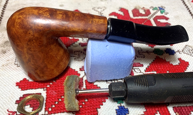 After remounting the stem ring, the stem and stummel are rejoined and after another cotton cloth wheel is mounted onto the rotary tool, carnauba wax is applied to the pipe (minus the ring) maintaining the same speed.