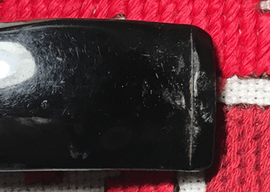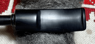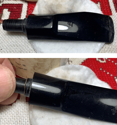 The black acrylic stem also has blemishes besides the chewing of and tooth chatter on the bit. The button, especially the lower lip, will need rebuilding.  There are smudges on the upper and lower staddle of the stem.