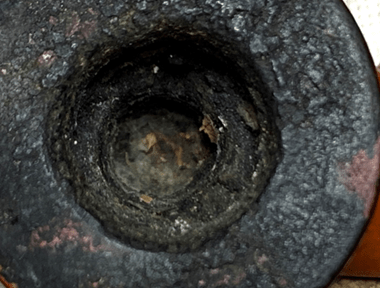 “How did I miss this?” were the first words surfacing in my mind.  This is not what one wants to discover when doing the final presentation pictures!  After reaming the chamber, I noted that there were some heating veins but missed that this crack extended to the rim – which at that point in the restoration was buried under layer of crusted lava.  Not good.  The options at this point are few, but the main issue is whether the crack continues to develop which may lead to catastrophic failure if not addressed.  Thankfully, the crack that runs down the chamber, seems to dissipate about halfway down and the small crack over the rim runs only an exceedingly small distance – not even 1/16 of an inch.  The chamber crack I would guess resulted from expanding pressure from the lack of cake maintenance.
