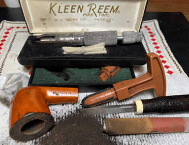To remove the cake and to uncover and inspect the briar beneath, the Pipnet Reaming Kit is used.  I use the first and smallest blade head to ream the chamber and I immediately see what could possibly have contributed to the poor chamber condition and the cake ledge at the midway point.  The shape of the Dublin chamber is conical and tapers more severely toward the floor and draft hole than other pipe shapes.  I burrow with the smaller blade head as far as it would go – watching the debris falling from the chamber to see when I might start grinding briar and not carbon.  After using the smaller blade head, I then utilize the Kleen Reem Pipe tool that I found at a flea Market in Kentucky a few years back.  The Kleen Reem Pipe Tool does well with the Dublin’s conical chamber.  With adjustable arm blades that expand by turning the handle at the top, I start at the floor with the tool fully closed. Then, as I rotate the tool to clear the carbon cake, it is drawn out slowly. With each movement upward and as the chamber widens the arms are expanded to remain snug against the chamber wall.  I work the tool slowly while gradually retracting it from the chamber. After the Kleen Reem Pipe Tool does his thing, the Savinelli Fitsall tool continues scraping the carbon from the walls.  Finally, the chamber is sanded using 240 grade paper wrapped around a Sharpie Pen.