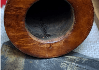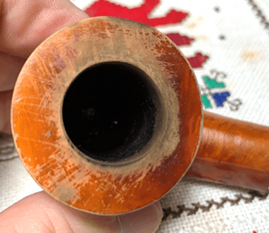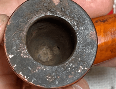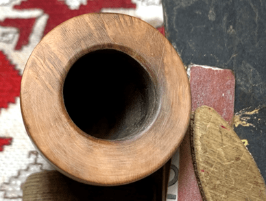 After wiping the chamber with a cotton pad, an inspection of the chamber reveals some heating veins which appear not severe but generally, healthy briar.  With so much carbon buildup, I would not have been surprised to have found serious heating crevasses in the chamber.  It will be a good idea to apply a protective ‘cake starter’ later using a mixture of activated charcoal and yogurt (or sour cream).