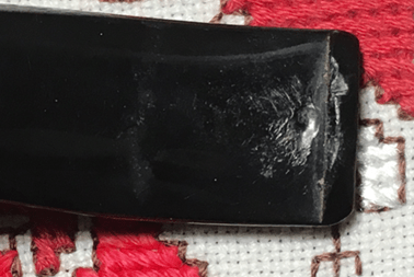 To address these issues, Black Medium-Thick CA glue is used.  I also utilize an accelerator to cure the CA more rapidly as the button is repaired.  I’ve already cleaned the surface with alcohol.  Black CA is then applied to the compressions and over the button lips and spray with the accelerator.  The toothpick helps with spreading the CA glue before spaying the accelerator.
