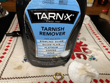 Tarn-x Tarnish Remover is used to clean the gold-plated nickel ring.