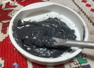 The yogurt and charcoal are mixed so that the mixture is thick enough not to drip off the pipe nail tool.