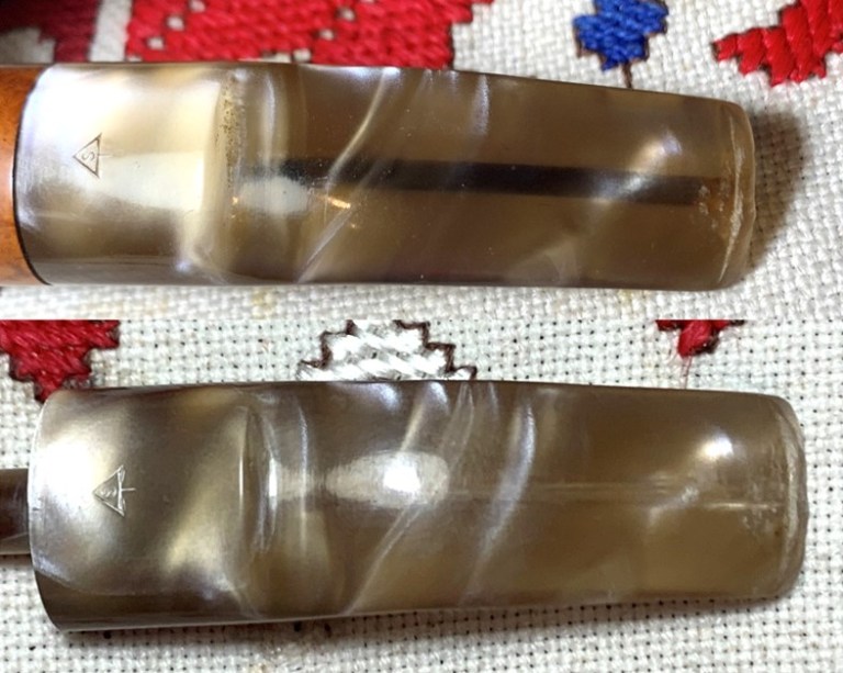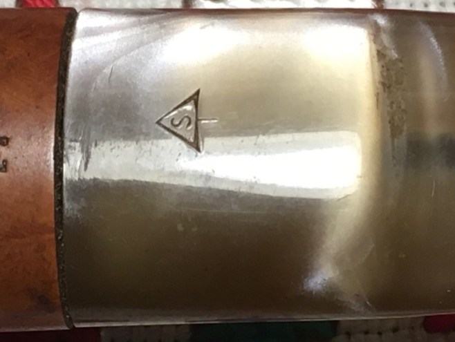 The stamping on the acrylic stem is on the top of the saddle. I have not seen this before and it is unusual. I would describe it as an arrowhead and shaft with an ‘S’ ensconced in the center. We will see if I can find it in the research!