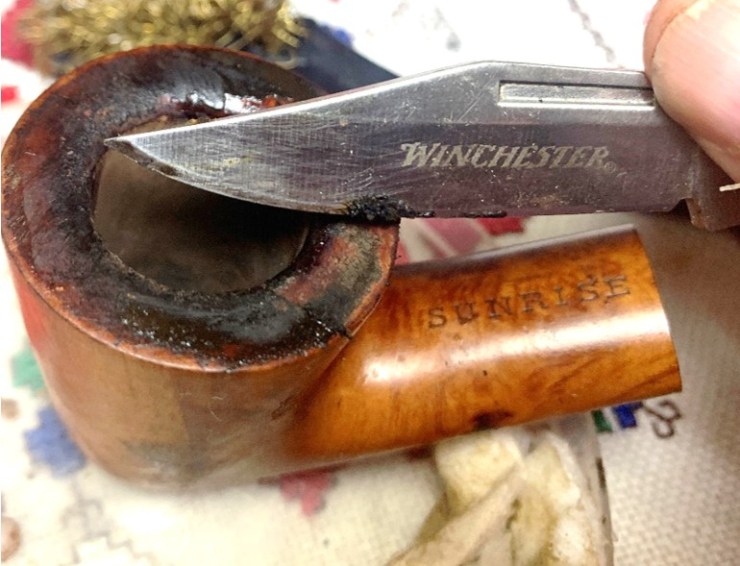 A cotton pad scrubs the surface and the stummel is grungy. The pocketknife is used carefully to scrape the rim. I drag the blade over the surface keeping it level. I drag rather than push the blade which helps to prevent unintentional cuts.