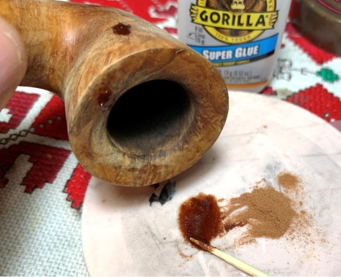 After wiping the fill areas with alcohol to clean, I mix a small batch of briar dust putty. I place a small mound of dust next to a small puddle of regular CA glue.