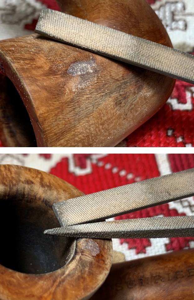 After the patches are thoroughly cured, removing the excess patch material starts with a flat needle file. Using the file, I file down the patches until they are flush with the briar surface. A tight square needle file is also used to hone in on the rim patch.