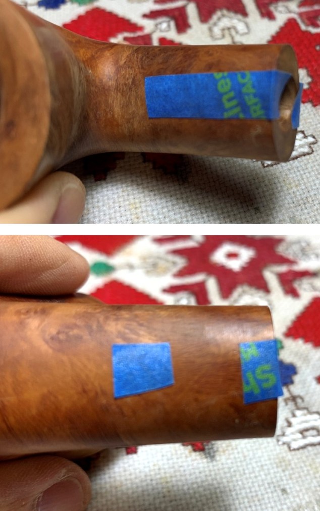 In preparation for sanding the stummel surface, I first cover the stampings of the nomenclature on the upper and lower shank to protect them.