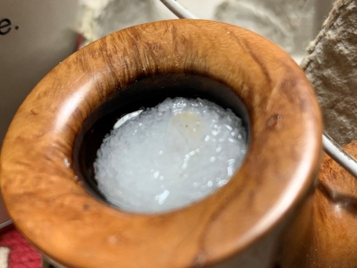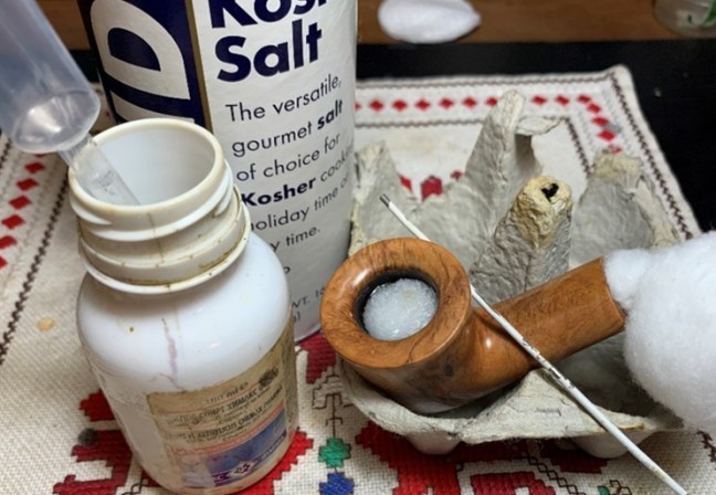 Next, kosher salt is used to fill the chamber. Kosher salt is used because it doesn’t leave an aftertaste like regular iodized salt. The stummel is then placed in an egg crate to give stability and to angle the stummel so that the rim and end of the shank are level. With a large eye dropper, isopropyl 99% fills the bowl until the alcohol surfaces above the salt.