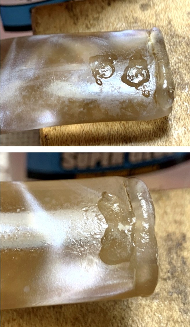 The plan is to rebuild the button – both upper and lower, with regular clear CA glue. An accelerator helps in holding the glue in place to do the rebuilding. Glue is also applied to the upper and lower bit filling the compressions. The smaller chatter will be sanded.