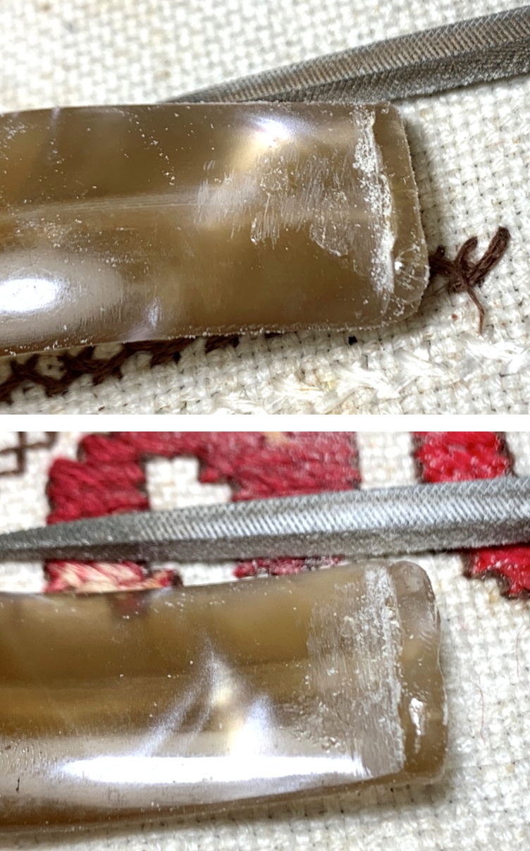 The dark area that at the crook of the shank that presented a heating problem turns out to be grime. The spot remains on the side of the oval shank – it appears to be grain distinction.