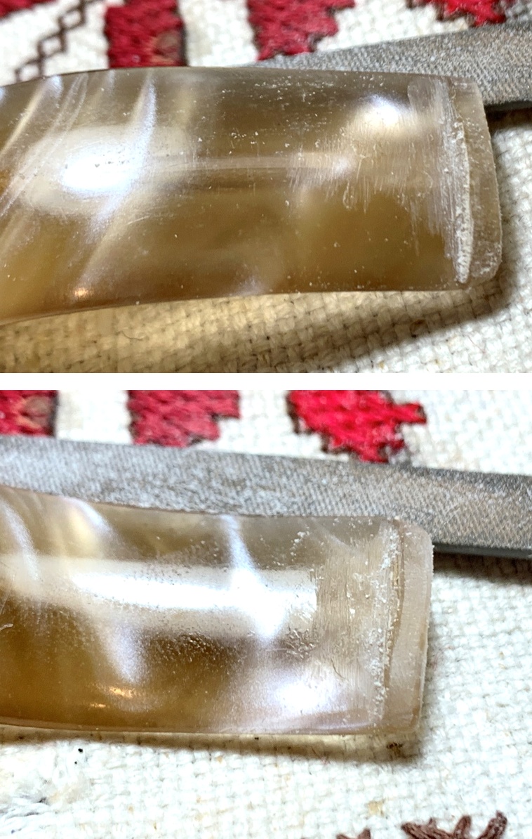 With the patches fully cured, the squared needle file goes to work first by defining the button and then expanding to filing the bit patches – upper and lower.