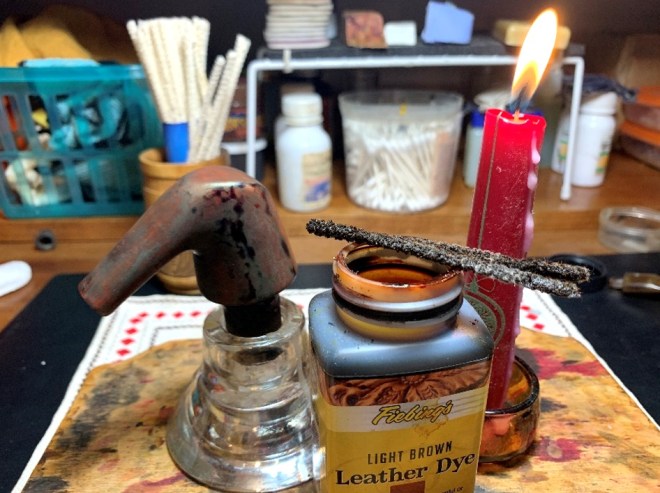 After the stummel is warmed, a folded pipe cleaner is used to paint the Fiebing’s Light Brown Leather Dye in swatches on the stummel. While the aniline dye is still wet, a lit candle is used to ‘flame’ the dye. The candle combusts the alcohol in the dye and leaves behind the pigment in the grain.