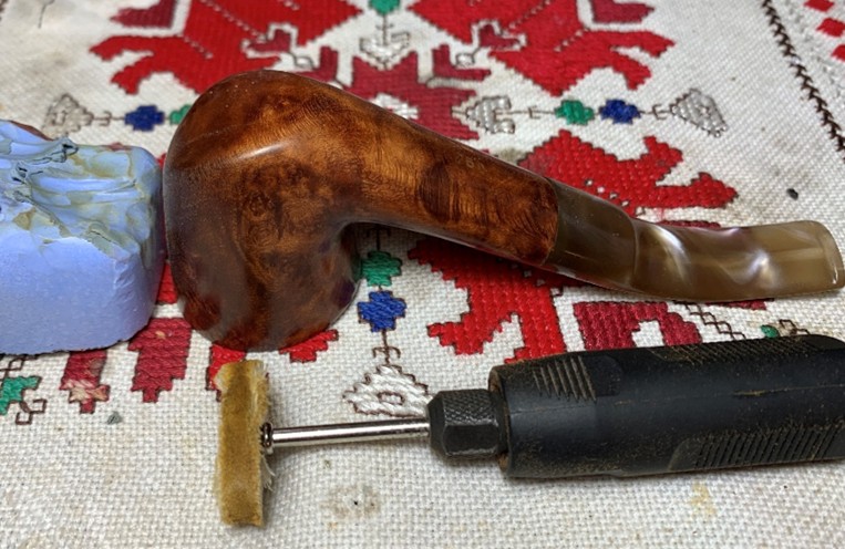 Next, after the Sunrise acrylic stem and stummel are reunited, another cotton cloth buffing wheel is mounted, and the speed of the rotary tool slowed to 40% full power. The finer Blue Diamond compound then applied to the entire pipe again removing more excess dye and sharpening the grain continues.