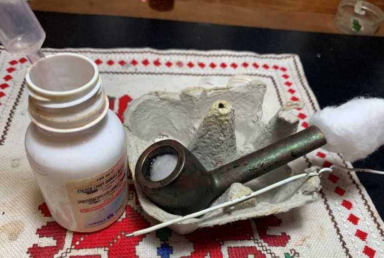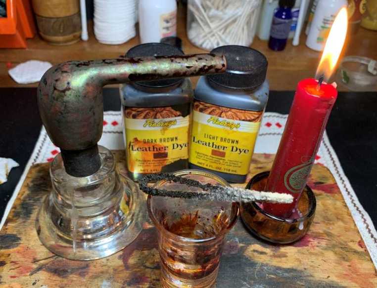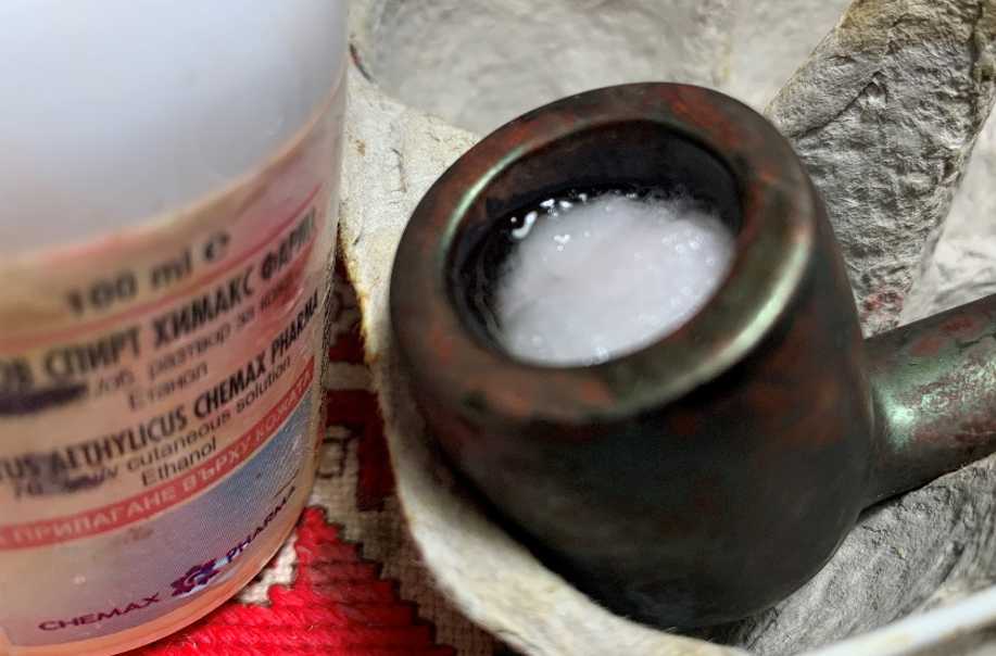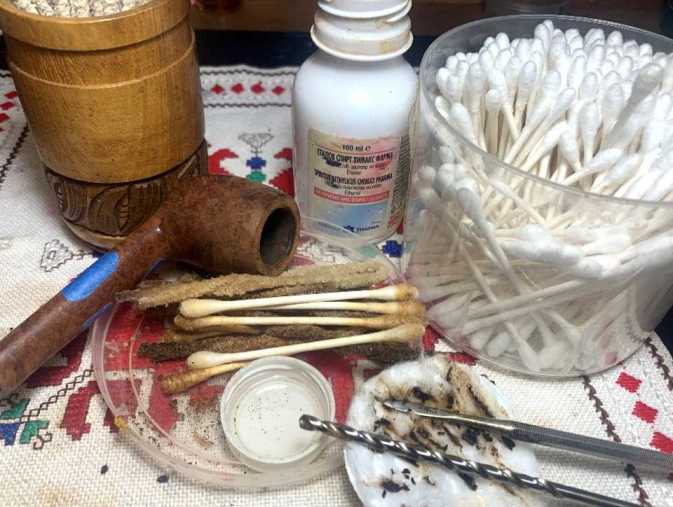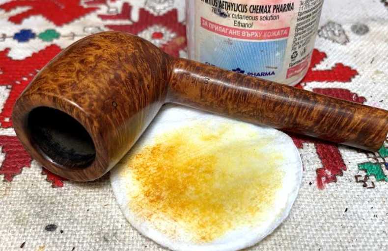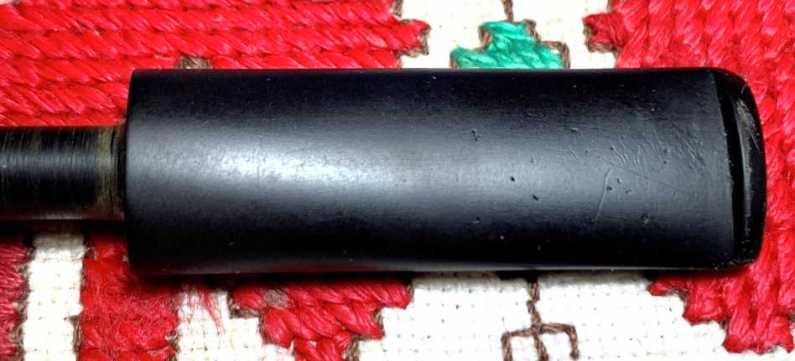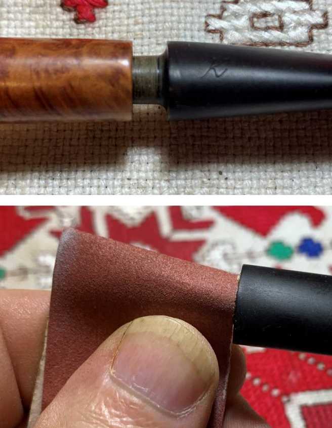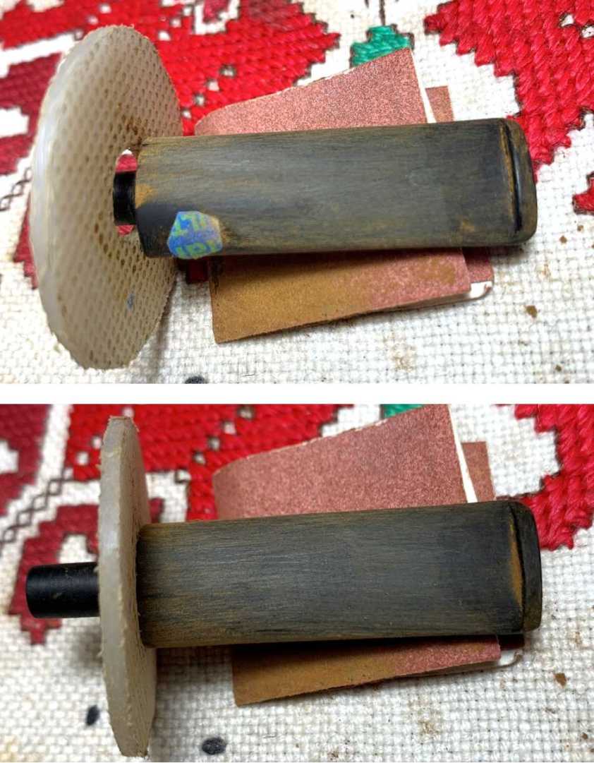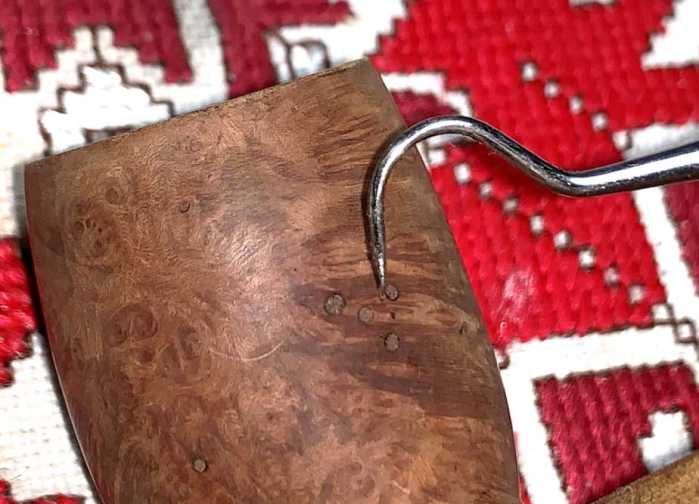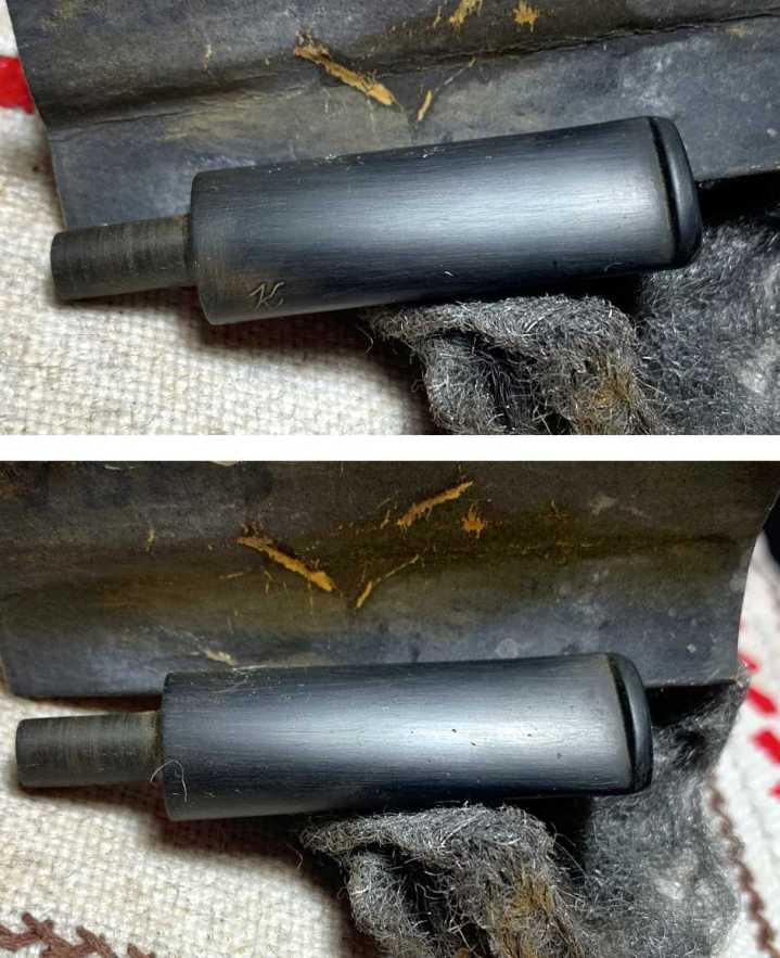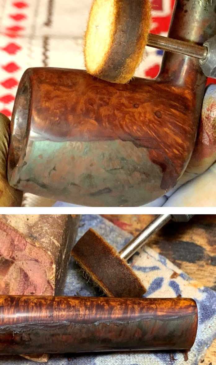 With a deeper understanding of the Comoy’s ‘The Kensington’ on the worktable, I take a closer look at the issues it has.  The Canadian is generally in a very solid condition.  The cake buildup in the chamber is minimal. The bowl needs cleaning for normal dirt and grime.  The most significant issue I see are the fills evident around the bowl. I count seven small fills mainly in patches of bird’s eye grain. The Canadian’s short stem is in good shape.  Almost no chatter to speak of and very mild oxidation.  The vulcanite surface is rough and will be smoothed through the sanding process. To begin the process of bringing this Comoy’s ‘The Kensington’ back to life, the short stem is cleaned with pipe cleaners wetted with isopropyl 99%.  When this is completed, the stem is placed in a soak of Briarville.com’s, Pipe Stem Oxidation Remover. After several hours of soaking in the solution, the stem is fished out and wiped briskly with a cotton cloth to remove the raised oxidation.  A pipe cleaner wetted with isopropyl 99% is also run through the airway to remove the Oxidation Remover residue. To give the vulcanite a kick start in rejuvenation, the stem is wiped with paraffin oil, a mineral oil.  The stem is put aside allowing the oil to be absorbed.  As an added note, the ‘valued’ Kensington ‘K’ stem logo went through the soak with no problems. With the stem waiting in the wings, I now turn to the stummel cleaning process.  The first thing to do is to clean the chamber of carbon cake buildup.  There is very little cake buildup as the starting picture below shows.  Still, I like to allow fresh briar to surface and to inspect the chamber for problems. Reaming the chamber utilizes 2 blade heads from the Pipnet Reaming Kit. The reaming is followed by scraping the chamber walls with a very helpful tool to have in one’s tool chest, the Savinelli Fitsall Tool.  It reaches the hard-to-reach places and does a great job on the floor of the chamber. This is followed by sanding the chamber to remove all the remaining carbon deposited on the chamber walls. 240 sanding paper wrapped around the Sharpie Pen does the job well.  The full cleaning arsenal is shown. After the chamber is wiped with a cotton pad, a picture shows the cleaned chamber.  A quick inspection shows no heating or burning problems.  Moving on! The next step is cleaning the external briar.  To do this, undiluted Murphy’s Oil Soap is used with a cotton pad to scrub the stummel surface.  A starting picture shows the rim grime. A cotton pad is used to scrub the surface.  My fingernail is used to scrape the rim surface as well as the edge of the pocketknife (carefully!). The pipe is then taken to the utility sink where using hot water and anti-oil liquid dishwashing soap, the internals are scrubbed using long shank brushes.  With the long Canadian shank, the brushes do a good job.  After the stummel internals are scrubbed and thoroughly rinsed, the stummel goes back to the worktable to show the results.  The grime has been removed and it appears the natural briar remains with the patina.  The rim cleaned very nicely but a black char ring remains around the internal rim lip and a little darkness on the forward rim. Looking now more closely at the stummel, a closeup of the rim shows the darkened forward section and the internal rim ring. I also inspect the small fills over the stummel. Often, after cleaning and the fills become wet, they will soften and shrink leaving gaps around the fills.  I look and test each fill with a dental probe and the good news is that they all seem to be solid.  This is good news, so I don’t have to replace the fills which leaves a lightened patch of briar around the work area.  I will leave the fills as is and after sanding the stummel with micromesh pads, check on them again.  It’s probable that a dye stick will be needed to mask the fills.  We’ll see. I start with the rim repair.  There are two issues.  The internal rim lip is darkened from the heating and normal use of the pipe. I’ll give the rim a very small bevel to clean the internal rim. I use a hard surface to pinch the 240 grade paper against the rim lip to create the bevel.  It works great.  The char ring is clean and most of the dark burning on the forward section of the rim is gone. Sanding with micromesh pads should finish the job. The beveling process is followed by using 600 grade paper. Before applying micromesh sanding to the stummel, painter’s tape is used to cover the ‘The Kensington’ nomenclature, COM and shape number stampings.  After spending so much time in research, I have no desire to erase this history from the pipe! Hold the press!  Just before starting the work with the micromesh pads, I realized that I had not completed the internal cleaning – so anxious to work on the stummel, it slipped my mind!  So, a little digression.  Using cotton buds and pipe cleaners wetted with isopropyl 99%, the internal cleaning continues.  The effort was aided by a small dental spoon that helps scrape tar and oil gunk buildup on the mortise walls.  The more that can be excavated like this, the fewer buds and pipe cleaners are needed.   Also useful is to use a 4mm drill bit, the standard airway drilling size. Drilling into the long shank helps to aid cleaning the tars and oils deeper in the shank.  I hold the bit stationary and rotate the stummel clockwise. The clockwise turning takes full advantage of the bit design. As the bit becomes more difficult to hold, I use the table vice to hold it in place while continuing the stummel rotation until reaching the draft hole.  To extract, I continue to rotate the stummel clockwise while applying gentle pressure pulling the stummel off the drill bit. The drill bit did the trick. Very soon the pipe cleaners and cotton buds were emerging lighter.  I stop the cleaning for now with the plan to continue the internal cleaning using a cotton bal