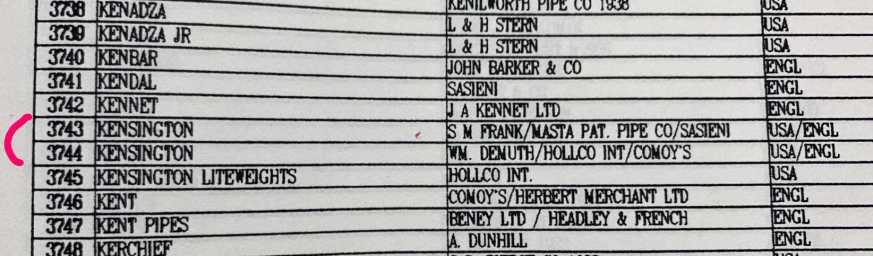 I want to thank you for reaching out to me about the Sasieni The Kensington.  The reason for my delay in getting back with details is because after getting your inquiry, I pulled The Kensington out of the ‘Help Me!’ basket and renewed my memory of this pipe.  I acquired it in January of 2018 and actually paid more for it than usual because I was drawn to it and was going to add it to my own personal collection.  The seller described the Canadian as a “Fantastic Sasieni Family era produced The Kensington” and that it was believed to be a second of Sasieni.  I recalled all this when I pulled it out to take a closer look at it after your note indicating the desire to commission arrived.  The interesting thing is that yesterday I looked at all my normal research places and The Kensington was not listed as a second of Sasieni.  Of course, these lists make no claims to be exhaustive, so the absence of a name doesn’t mean that it isn’t a second.  WDC put out a “Kensington” line according to the Pipedia and Pipephil.eu information which is one of the other possibilities given an English COM which is what we’re looking for, yet the stem logo (‘K’) and stamping (‘THE Kensington’) just don’t match from the examples given ascribed to WDC.  The only positive (so far) hit that I got relating ‘The Kensington’ to Sasieni is from my prized copy of Herb Wilzak & Tom Colwell (3/3/97) ‘Who Made That Pipe?’ – a directory of briar pipe names, their makers/sellers, and countries of origin in the 19th and 20th century, gives a UK COM for Kensington to Sasieni (and other American possibilities).  So, I don’t usually do this much research before I actually get to the pipe on my worktable….  But last night I looked through all my catalogues trying to find another confirmation of ‘The Kensington’ not simply ‘Kensington’ with a UK COM and could not!  It doesn’t mean that I’m finished looking, but I did want to respond to your inquiry….