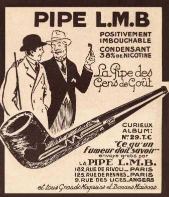 L.M.B. in 1911, rue du Mont-Thabor, assures that “his systeme is recommend by the Medical profession, the efficient only one positively imbouchable, condensing 38 % of nicotine, getting clean avtomatiquement, and approve by the Societe d’ Hygiene of France”. He adapts the conduit in plexiglass transparent has the modern pipe by 1960.