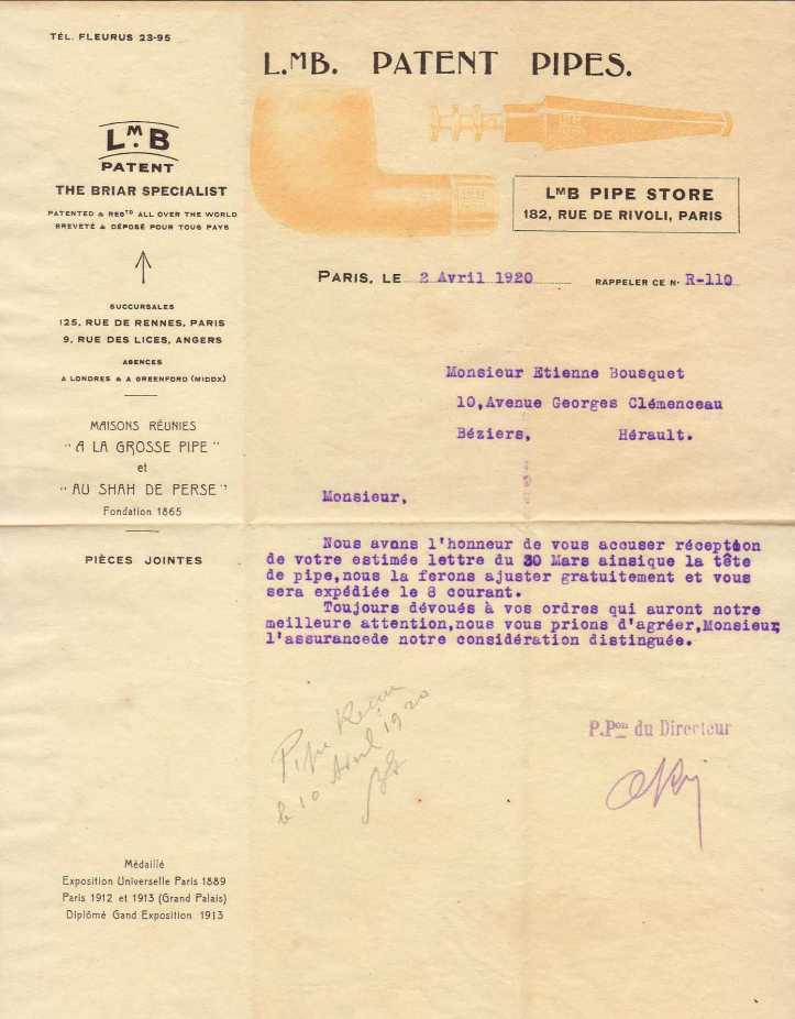 From this information I think I’ve solved the question of ‘L.M.B.’.  Jumping out is the region of Saint Claude – Levans and the two families of Moquin and Breuil – aka, L.M.B.  Yes!  This information says the company was founded in 1924, but there are catalogs and the letter posted above predating 1924.  The two L.M.B. catalogs linked in Pipedia are from 1920 and 1923.  This is an interesting question.