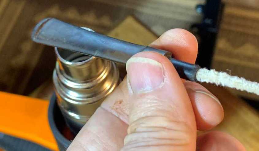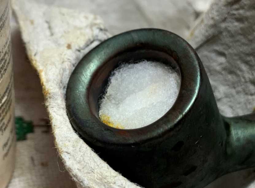 With a better understanding and appreciation of the L.M.B. company, now looking at the issues of the L.M.B. on the worktable, the chamber has thick carbon buildup and the lava flow over the rim is significant.  The rim also has some nicks and dents that need addressing, but the shaping of the rim has a touch of class – a gentle internal rolled bevel. The bowl is cratered with several old fills that have worn away or totally vacated.  This will take some work, but the briar has some potential if it can be cleaned and repaired. The saddle stem has oxidation that needs to be removed and some tooth chatter.To begin the restoration of this L.M.B. Aspir, the first step would be to clean the stem’s airway in preparation for putting it in a soak to remove the oxidation.  However, when the pipe cleaner was inserted into the airway, it would not move through.  It felt like the stem was almost compressing the airway or an obstruction was blocking the way.  To remedy this, a hot air gun was used to heat the vulcanite to soften it.As the rubber compound warmed and became more supple, a pipe cleaner was used to push through to expand the airway.Well, it isn’t pretty, but the heating helped to expand the airway, but it also helped to loosen the constipation of gunk that had collected in the airway ☹.To help with the cleaning, a bristled pipe cleaner, moistened with isopropyl 99%, is clamped in the table vice and while holding the loose end of the pipe cleaner, the stem is moved back and forth and rotated to create more cleaning muscle.  Eventually, the major gunk was excavated.The cleaning was then continued in the normal way using pipe cleaners and isopropyl 99%.To get a head start breaking up the oxidation and calcification on the stem surface, 000 grade steel wool was used to scrub the stem surface careful to avoid the ‘A’ stem logo.The stem is next placed in a soak of Briarville’s Oxidation Remover.  The stem soaks for several hours.When the stem is removed, a cotton cloth is used to briskly rub off the raised oxidation.  A few pipe cleaners wet with isopropyl 99% are used to clear away the residual fluid of the Oxidation Remover.To help the conditioning of the vulcanite stem, Paraffin oil is applied, and the stem is put aside to allow the oil to absorb.Turning now to the cleaning of the bowl, reaming the thick cake in the chamber is the starting point.With the smaller chamber, the smallest blade of the Pipnet Reaming Kit is alone used and only partially.  The chamber tapers toward the floor and narrows.  I do not want to create a wedge digging into the briar midway.  Next, the Savinelli Fitsall Tool continues the scraping of the chamber wall.  Lastly, 240 sanding paper wrapped around a Sharpie Pen sands the chamber removing the final vestiges of carbon cake.After wiping the chamber with a cotton pad, an inspection of the chamber reveals healthy briar.Moving next to cleaning the external surface, undiluted Murphy’s Oil Soap is used with a cotton pad. A brass brush is also used to work on the thick lava crusted on the rim. Brass bristles add to the cleaning muscle but do not harm the briar.The stummel is next taken to the sink where the cleaning continues using hottish water and working on the internals with shank brushes and anti-oil liquid dishwashing soap.  The internal mortise and airway are scrubbed and after rinsing thoroughly, the stummel returns to the worktable.Next, the cleaning focusses on the internals using cotton buds and pipe cleaners moistened with isopropyl 99%.  Remembering the condition of the stem’s clogged airway, I’m expecting a lot of gunk.  After a couple cotton buds were expended, scraping with a small dental spoon assists in excavating the gunk on the internal walls.  I take a picture of one shovel full 😊. It takes some time, but the buds and cleaners start emerging lighter and the cleaning is called to halt to be continued later with a cotton ball and alcohol soak to draw more of the tars and oils out of the internal briar.With the cleaning halted, I take a closer look at the stummel.  The rim is in rough shape, as expected.  There is residual staining from the lava crust that had encased the rim. Wherever I look on the rim, there are scratches and dents as the following pictures show.  This guy has been through it!A survey of the briar surface reveals what can be described as a moonscape.  This was a forgone reality from the beginning.  I haven’t counted how many old fills there are, but it will keep me busy for a while.  The fills are predominantly on the stummel’s left side. There are a few fills on the right side close to the nomenclature stamping which will need some care so as to not impact the stampings.Work starts on the rim, and I work my way down.  The rim has an inwardly tapered rounded bevel.  To clean the rim 240 paper is used.  The approach simply is to pinch the paper against the internal bevel with the thumb and briskly rotating around the rim. While sanding, I discover that the rim plateau is not even – the level of the rim is not true.  To address this the topping board is used with 240 paper on it.  The picture below shows only a few rotations which reveals the uneven contours I noticed.  The sanding contact points reveal unevenness and gaps where the sandpaper is not contacting the rim.  This reveals the dips in the rim surface.The stummel is rotated a few more times only to the point where there is a level surface going around the entire rim.  This provides the base line for the sanding to continue evenly cleaning up the bevel.The 240 sanding continues as described before with the goal to even out the bevel so that it is uniform around the rim.  I like the results.Next, the rim is sanded further with 600 grade paper and the grain starts to emerge.  This L.M.B. Petite Billiard and some nice-looking briar.With the rim sanding completed to this point, attention is now turned to the moonscape of