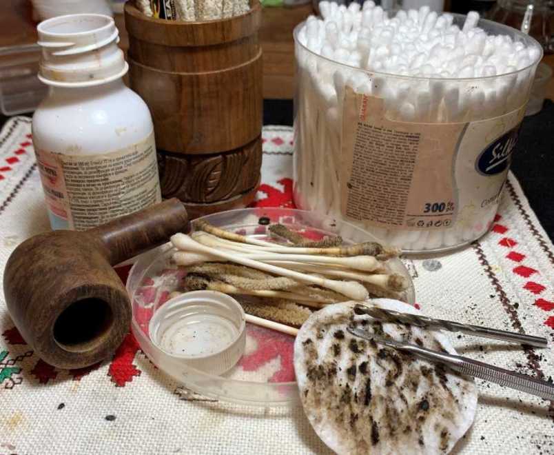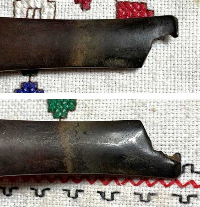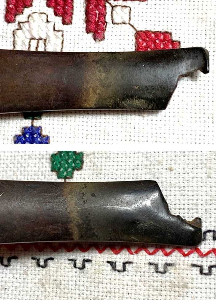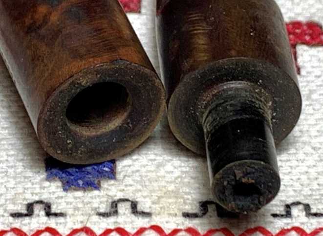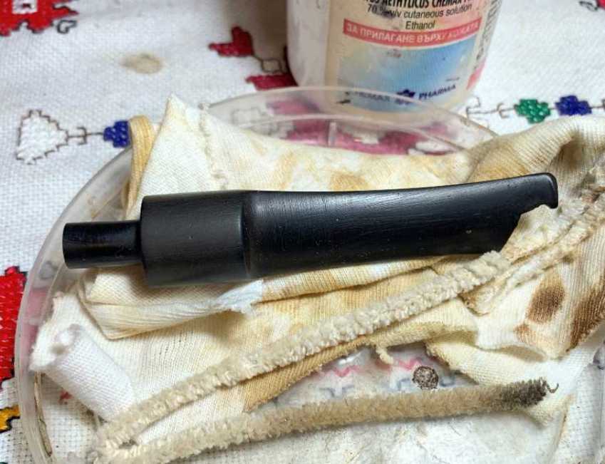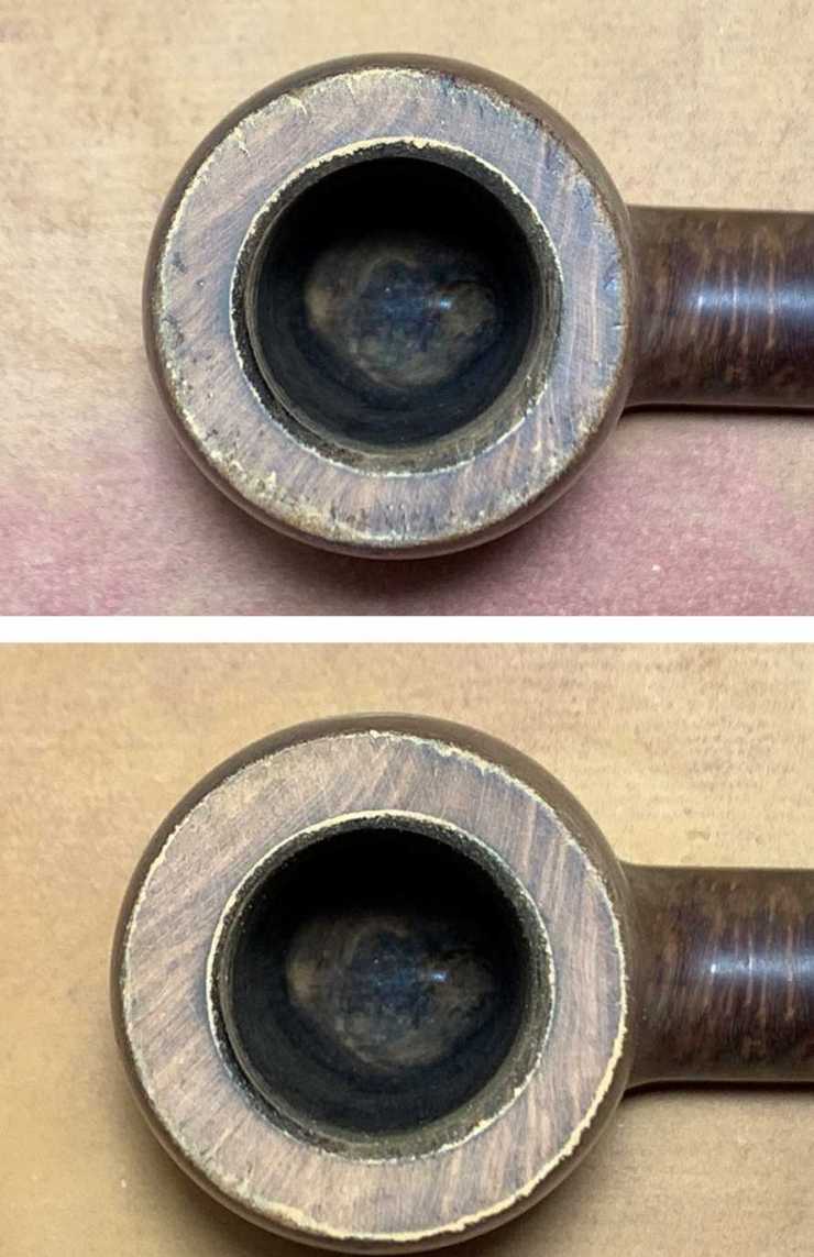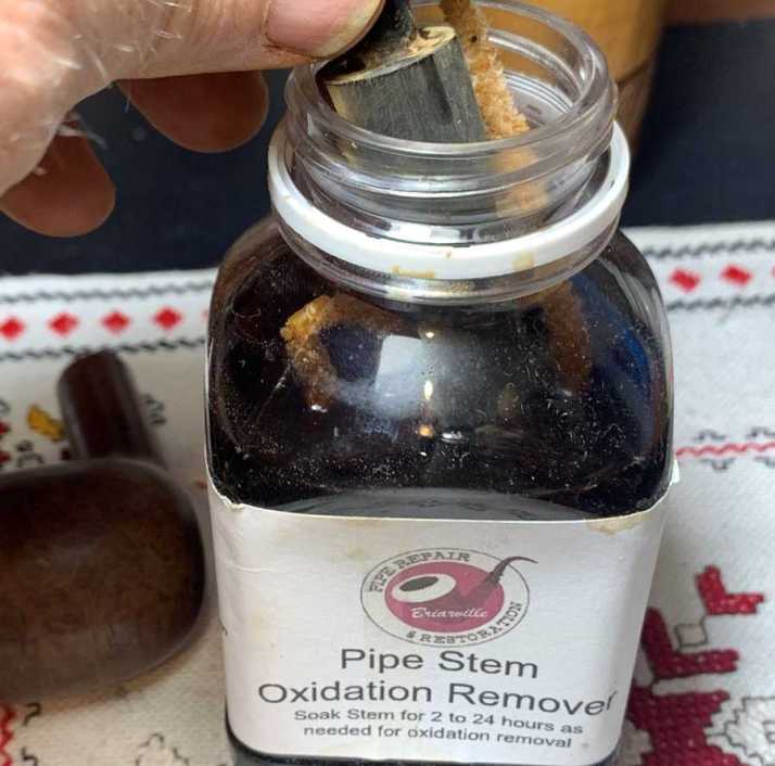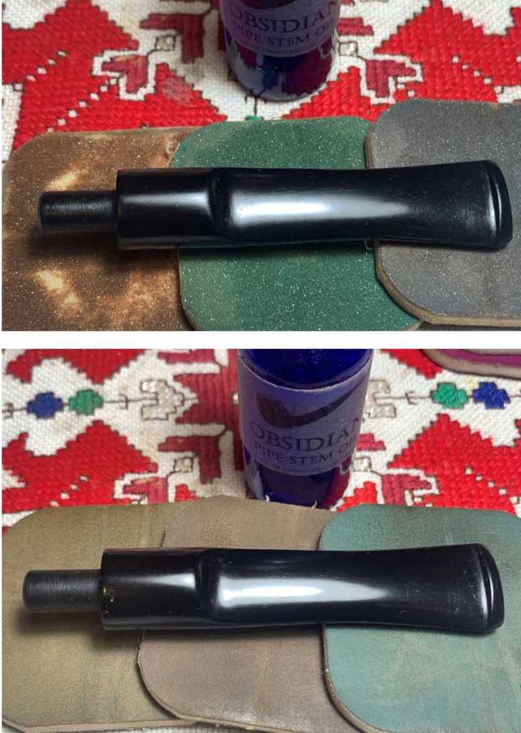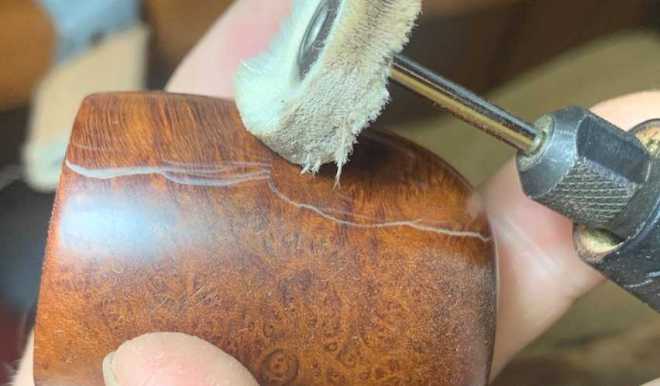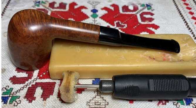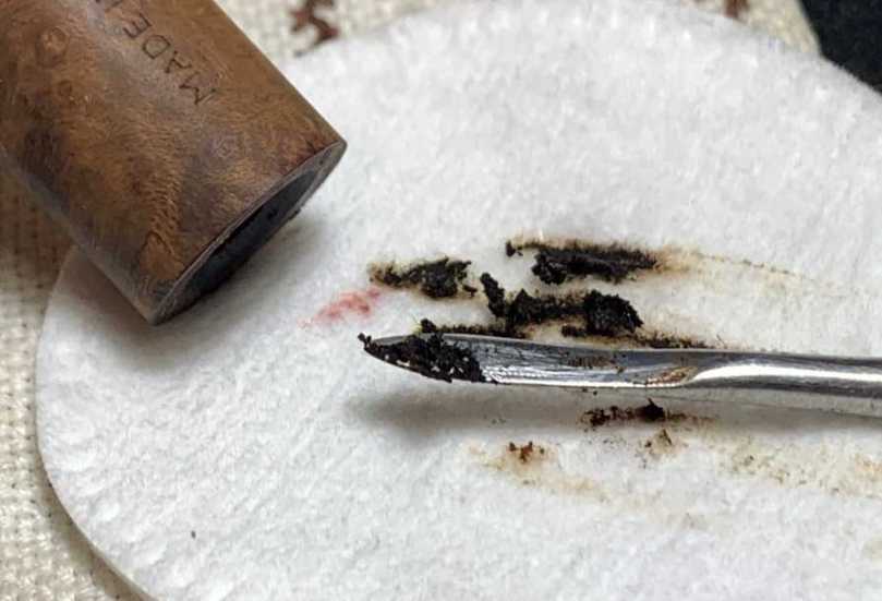 Yet, it is a very attractive and what I would describe as a stout Billiard.  The dimensions are length: 5 7/8 inches, height: 1 7/8 inches, rim width: 1 1/4 inches, chamber width: 3/4 inches, chamber depth: 1 5/8 inches.  The condition of the pipe shows some challenges.  The chamber has some thick carbon cake which will be removed down to the briar.The rim has grime and lava flow.  The edge if the rim is nicked and has some small dents from wear and tear.  There are also significant scratches over the rim plateau.There are some nicks and scrapes on the bowl, but generally, the dirt and grime are thick and need general cleaning to allow the nice-looking grain beneath to emerge.The big issue with the McMillan is the stem.   The bit has been obliterated with a break that has removed about 7/16 inches off the left-side length of the stem.  The width of the break is about 5/16 inches.  This catastrophic break is too much to rebuild the missing bit and button.  The only other options are to cut the stem and to build a new button on the amputated end or to find a replacement stem in my old stem can that will do the job.  The stem also has deep oxidation and calcification on the bit.  The pictures below show the deep brown/green of the oxidized vulcanite and the remnant of the bit.Without deciding on cutting the stem and rebuilding a button or seeing if I can find a replacement, I decide to continue with the stem cleaning to see how things shape up.  Using pipe cleaners moistened with isopropyl 99%, work on the airway begins.  I discover that the airway is partially blocked with gunk so once I was able to navigate a pipe cleaner through the stem, one end of the cleaner was clamped in the table vice to enable me to clean the airway more forcefully.  Holding the pipe cleaner taut, the stem is moved briskly back and forth and rotated. After this, the cleaning continues in the normal way with pipe cleaners and isopropyl 99%.  It takes a bit of effort, but the cleaners begin to emerge lighter.The next few pictures show the thickness of the oxidation in the vulcanite stem.To get a head start removing the oxidation, moistened with alcohol 000 grade steel wool is used to scrub the stem surface.Next, the stem is put into a soak of Briarville Pipe Stem Oxidation Remover to work on oxidation.After several hours, the stem is removed from the Oxidation Remover and briskly rubbed with a cotton cloth to remove the raised oxidation.  Another pipe cleaner moistened with isopropyl 99% is used to clear the airway of the excess Oxidation Remover fluid.To help condition the vulcanite, Paraffin oil is applied to the stem and then put aside to allow the oil to be absorbed.Moving next to the stummel, the starting picture marks the progress removing the thick cake buildup in the chamber.Using the Pipnet Reaming Kit, 2 of the 4 blades available are used starting first with the smallest and then the next larger.  Next, the Savinelli Fitsall Tool is used to continue scraping the chamber wall and the chamber is finished by sanding the chamber walls with 240 grade paper wrapped around a Sharpie Pen to give more leverage.After wiping out the carbon dust, a quick inspection of the chamber wall shows healthy briar and no heating problems.Turning now to the external cleaning, undiluted Murphy’s Oil Soap is used with cotton pads.After scrubbing the briar surface with the cotton pad, a brass wired brush is used to scrub the rim.  The brass adds to the cleaning muscle but does not harm the briar.Next, the stummel is taken to the sink and using shank brushes and anti-oil dishwashing soap, the internal mortise and airway are scrubbed with hottish water.  After a thorough rinse, the stummel is returned to the worktable.The internal cleaning continues with cotton buds and pipe cleaners wetted with isopropyl 99%. A small dental spoon also helps with the cleaning by scraping the mortise walls to remove the thick tars and oils that remain after the previous sink cleaning.  To the degree that the gunk is shoveled out, it helps the pipe cleaners and buds do their part.The internals are pretty grungy.  To help with the airway, a drill bit the same size as the airway is hand turned to scrape the airway beyond the mortise to the draft hole.  I forgot to take a picture of the drill bit with gunk packed in the drill threads. After a good bit of effort, the buds and cleaners start to emerge lighter, and the work is called for the time.  I’ll continue the internal cleaning later with a cotton ball and alcohol soak.With the primary cleaning completed on the stummel, a closer look at the stummel shows a very nice-looking batch of briar.  I can find no fills on the surface.  The patina is rich and dark.  This stummel should spruce up very nicely.The rim cleaned up nicely as well.  The grain is showing with only a small amount of dark briar from heating on the inner rim.  The rim has a smart bevel which will be refreshed.  The picture below shows the significant scratches over the rim on the lower side of the picture. To refresh the rim and to remove the scratches and dents on the edge, I top the rim using 240 paper on a chopping board.  A starting picture is taken to show the rough condition of the rim and to mark the progress.With the stummel inverted on the paper, it is rotated a number of times over the 240 grade paper.The first check shows a level topping, and the rotating continues.The picture below shows that enough briar has been topped using 240 paper.  There remains some roughness on the rim’s outer edge, but this should sand out later.The 240 paper is exchanged for the finer 600 grade paper and the stummel is rotated several more times to smooth the surface further.  I’m liking what I’m seeing.  The rich, expressive grain is coming out very nicely and the topping has left a balanced rim plateau.With the rim topped and looking good, the next step is to refresh the smart bevel to remove the darkened