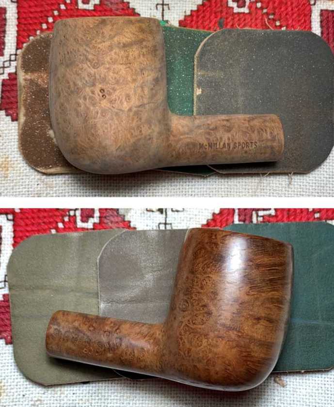 In January of 2018 I saw this fist-filling saddle stem Billiard on the online auction block from a seller in Hillsdale, Indiana.  The obscured grain had great potential, but the stem needed a good bit of help.  I put out a bid and brought this stout Billiard home to Bulgaria where we lived at the time.  It found its way to the ‘For “Pipe Dreamers” ONLY!’ collection for pipe men and women to commission benefitting the Daughters of Bulgaria, an effort that my wife and I founded in Bulgaria that continues today helping women and girls who have been trafficked and sexually exploited.Pipe man Mike from Tennessee heard the whisper of this pipe and the McMillian Sports joined other pipes he commissioned.  I appreciate Mike’s love of pipes and the fellowship that pipes create with likeminded folks.  I also appreciate Mike’s other hobby of threading and creating flies for those who know the art of fly fishing.  I took this picture from Mike’s FB page to show his skill.  Mike is also a veteran and has served his country with distinction – this I appreciate so much.With the McMillan Sports now on the worktable, here are pictures of the next pipe Mike has commissioned. The nomenclature stamped on the left side of the shank is: McMILLAN SPORTS.  The right shank flank is stamped with: MADE IN ENGLAND [over] 60S, which I assume is a shape number from the manufacturer. From the outset, with the stamping, ‘McMillan Sports’, it is most likely that this pipe is a ‘shop pipe’ – a pipe specially manufactured for an establishment, business, or shop, and stamped with its name.  Pipes like this rarely are referenced in the normal sources I frequent to learn of the provenance of the pipes I work on.  After looking online for any information, this is exactly what I find – no specific information regarding a ‘McMillan Sports’.  I search online for any specific connection with a sports club, pub, team, and come up empty. I focus this search in London, then England, and also Scotland and no specific hits.  One last effort to gain some traction to ascertain the provenance is to research the shape number. Using the shape number 60S, I search the shape numbers lists for well-known English pipe manufacturers to see if I could identify a Billiard like the one on my table matching a shape number in use by a manufacturer.  This also found no traction. And so, another pipe remains in mystery on my worktable.