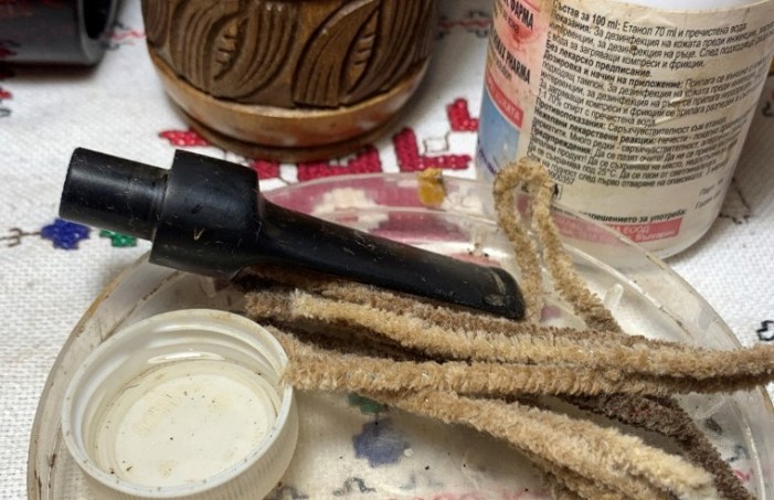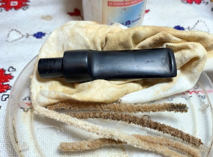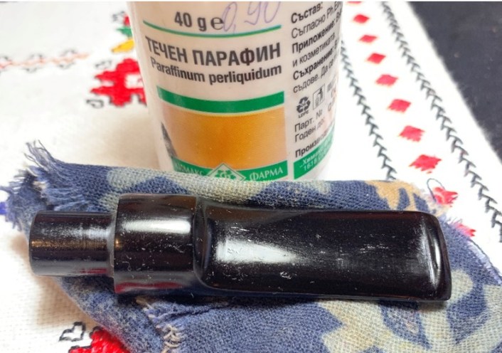 The Cyrillic lettering on the bottle that came with me from Bulgaria says, Liquid Paraffin. Paraffin oil is a mineral oil that I use at this point to help condition the vulcanite stem. After the oil has been thoroughly applied, the stem is put aside to allow the oil to be absorbed.