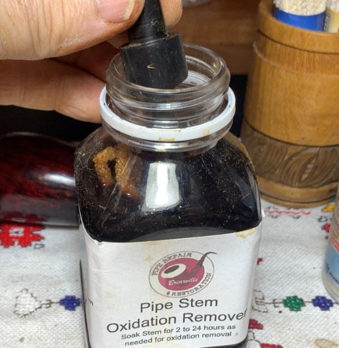 After cleaning the airway, the stem is placed in a soak of Briarville’s Pipe Stem Oxidation Remover for several hours to address any oxidation in the vulcanite.