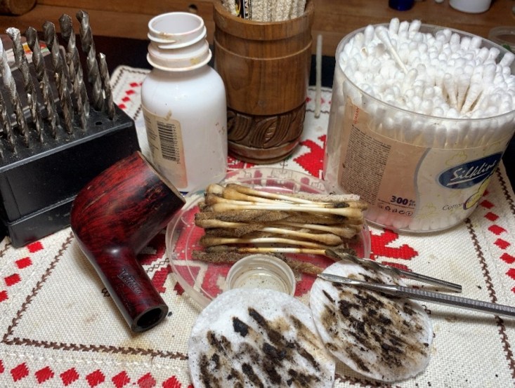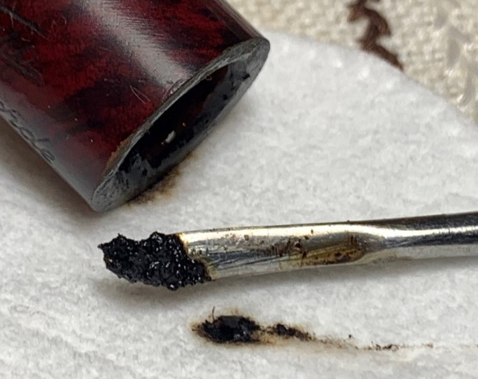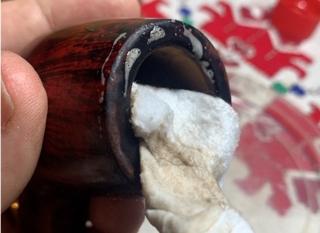 The next day, the cotton is removed from the stummel, and the soiling shows the process of drawing the tars and oils out during night.