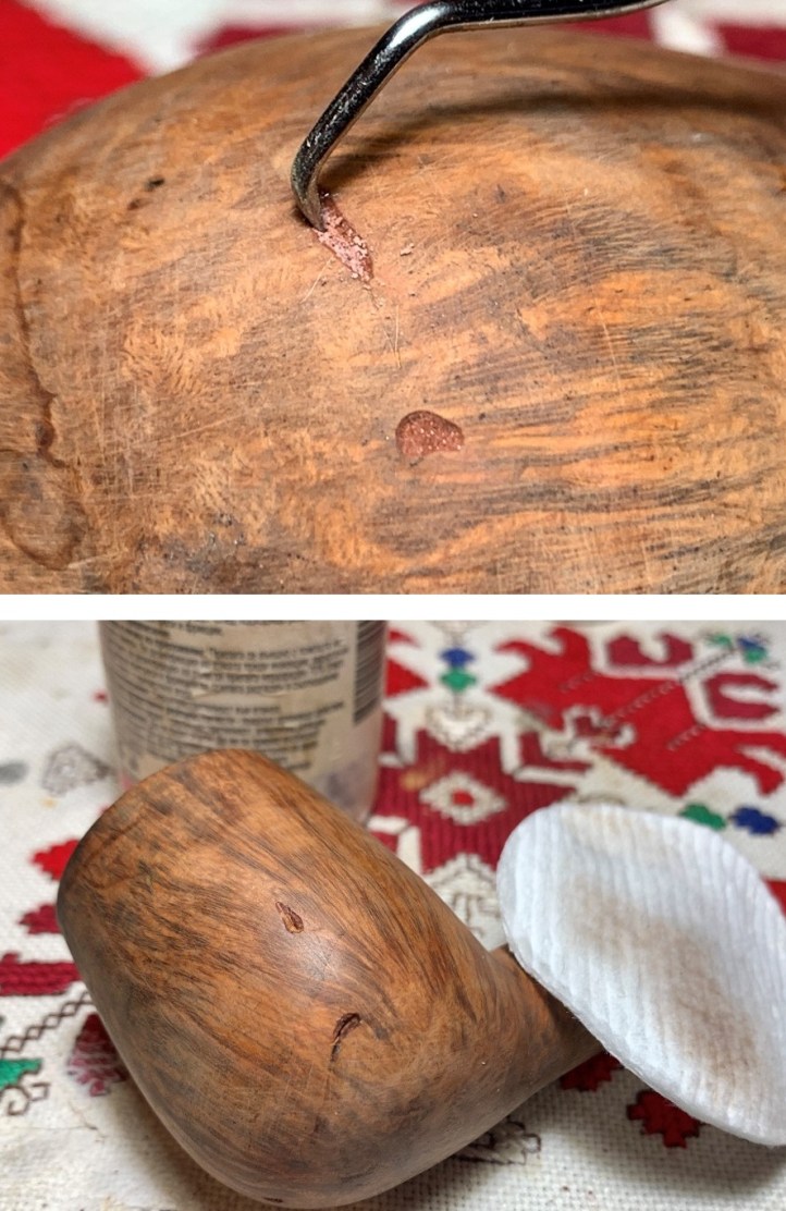 Some fills are discovered after the removal of the old finish. The fills are not flush with the briar surface so new patches need to be applied.