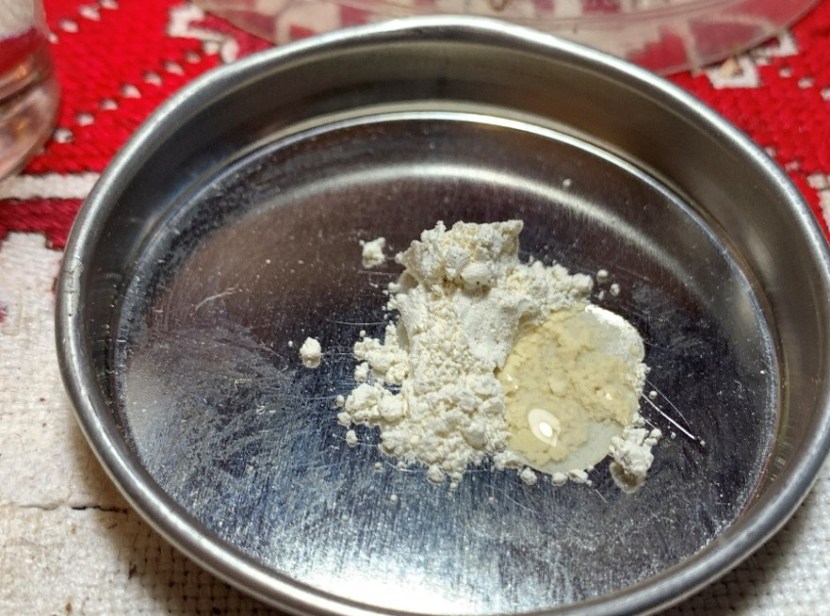 Per the directions, some of the filler powder is placed on the lid and a couple of drops of water are added.