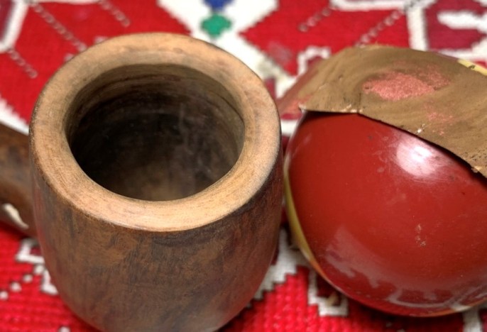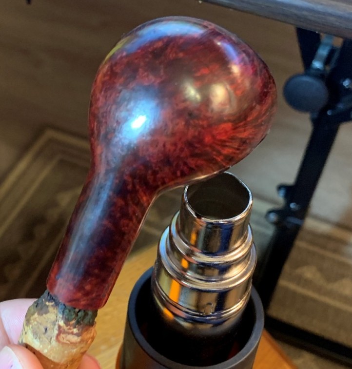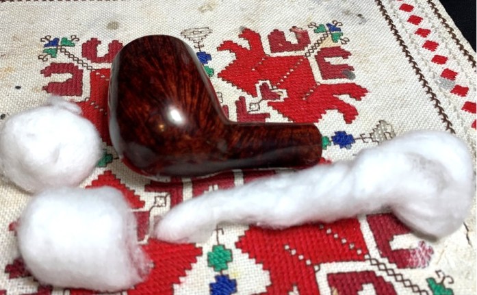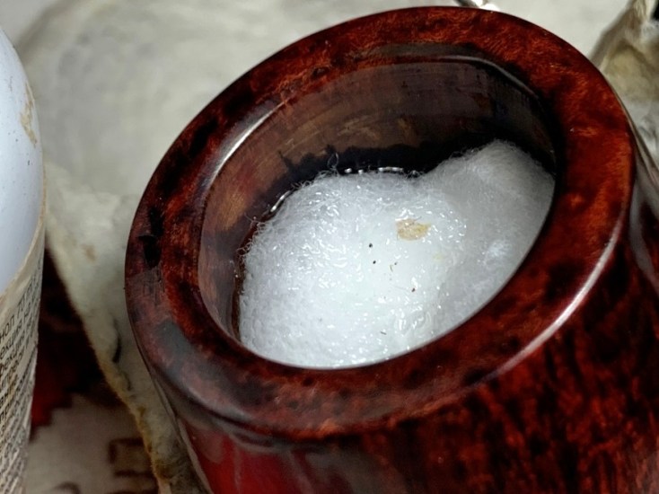 The end of the day has arrived, and the internal cleaning will continue to make sure the pipe is fresh and clean for a new steward. Using 2 cotton balls to fill the chamber (this is a large chamber!), another cotton ball is used to fashion a cotton wick that is guided down the mortise and airway with the help of a stiff wire. The ‘wick’ serves to help draw tars and oils from the internal briar surface.