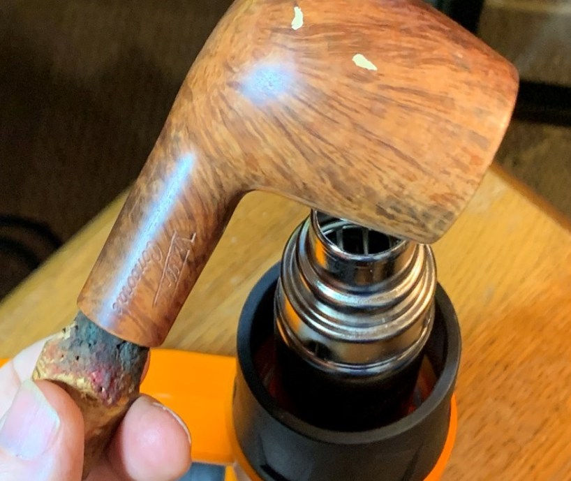 One more mini project is planned with the stummel before reuniting with the stem and applying the wax. To prevent dye leeching on the fingers of a new steward, heating the stummel is one more way to remove excess dye. The stummel briar is warmed with the hot air gun emulating the pipe in service.