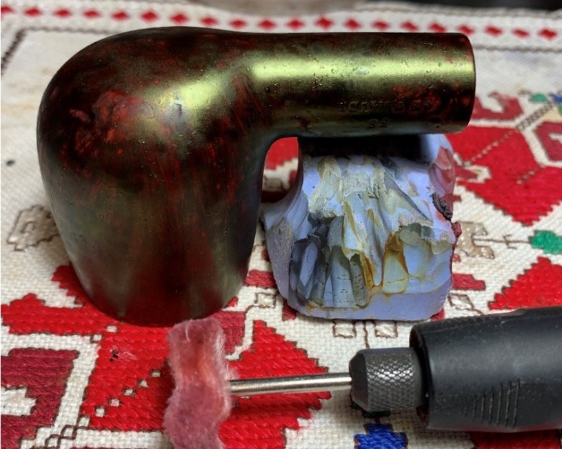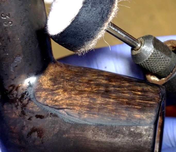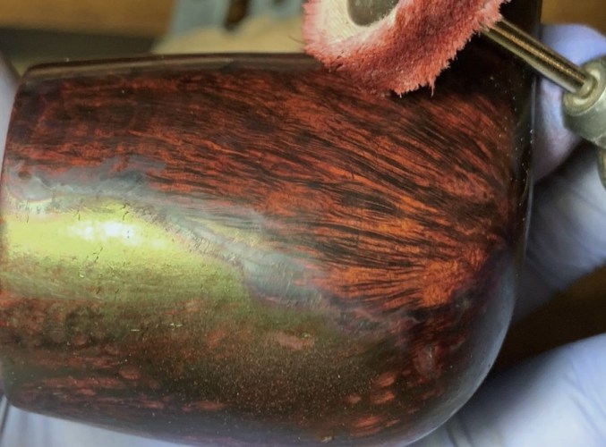 The next day, to ‘unwrap’ the flamed crust on the stummel, a felt cloth buffing wheel is mounted to the rotary tool with the speed set to about 35% full power – a bit slower than normal. Red Tripoli, a coarser compound, is then applied to the briar surface. The speed is slowed a bit to prevent too much heating from the coarse felt wheel and the compound. The picture shows the progress as the felt wheel ‘plows’ the flamed dye. The contrasting of the black dye is emerging.