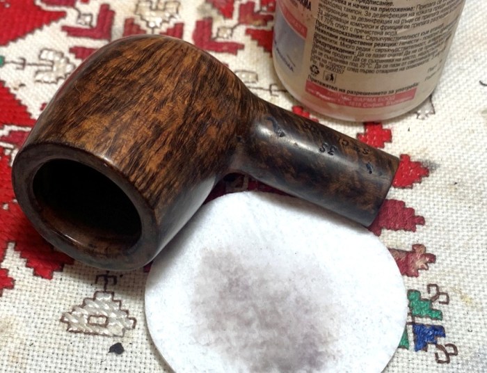 After the Tripoli compound, the stummel is wiped with a cotton pad wetted with alcohol to blend the new dye and to remove excess dye preparing the surface for the next dye coat.