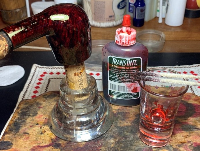 After the stummel is warmed, a folded pipe cleaner applies the red dye to the stummel. The red dye I have is not aniline, so it is simply ‘washed’ over the stummel. Once thoroughly covered, the stummel is set aside through the night to allow the red dye to settle.