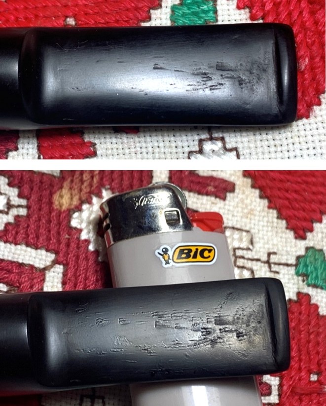 With the stummel on the sideline, turning to the stem, I take a closer look at the scars in the vulcanite stem. The appearance of the scars is over the entire stem and appear to be cuts from the pipe being in a can with a sharp edge or something like this. There is some tooth chatter, but most of the damage are cuts and gashes. I decide to try the heating method to see if the heating of the rubber compound will heal its wounds like with tooth chatter. The heated vulcanite will expand and reclaim the original condition. What I discover with heating the cuts is that the opposite happens. The heating exasperates the scarring as the before and after pictures following show. First, the upper stem: