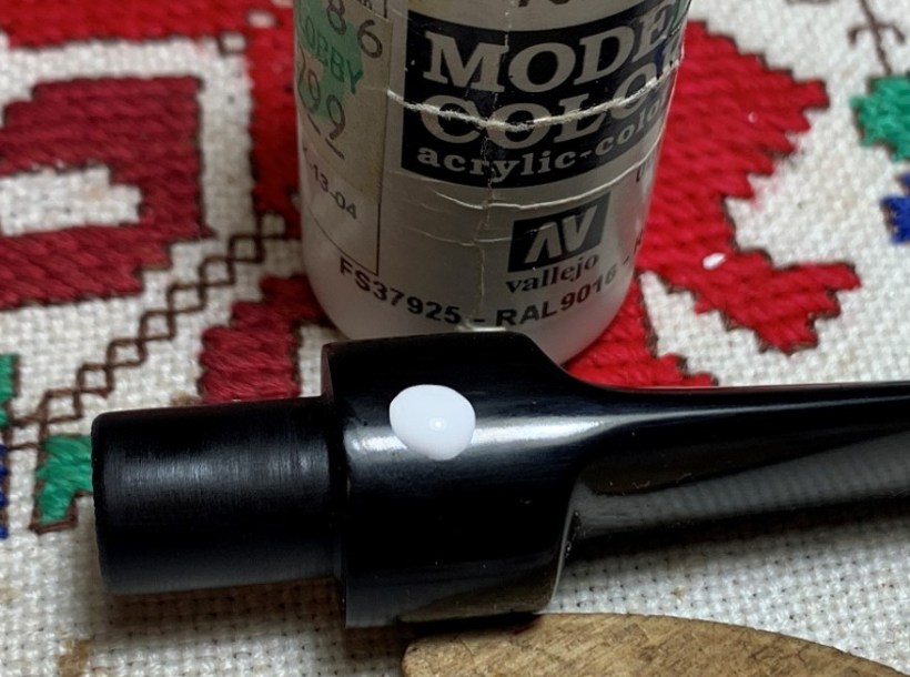 The next mini project with the stem is refreshing the Vuillard ‘V’ stem logo. The ‘V’ is ghosted and worn down on the upper side. We’ll see how well the paint adheres.