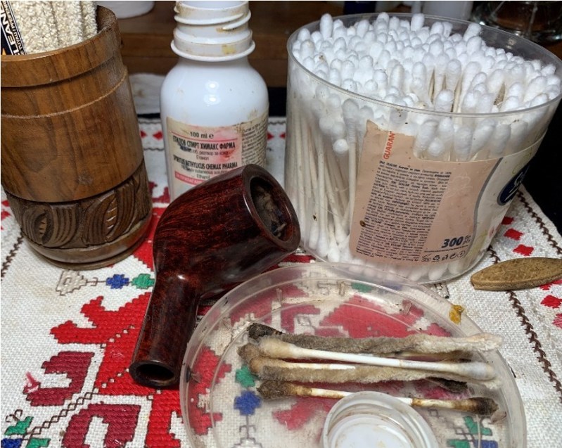 To remove any residual tars and oils, cotton buds and pipe cleaners moistened with isopropyl 99% are used. Initially, the buds were very soiled, but they lightened quickly. A whiff test confirms the freshness of the stummel internals for a new steward.