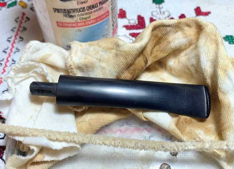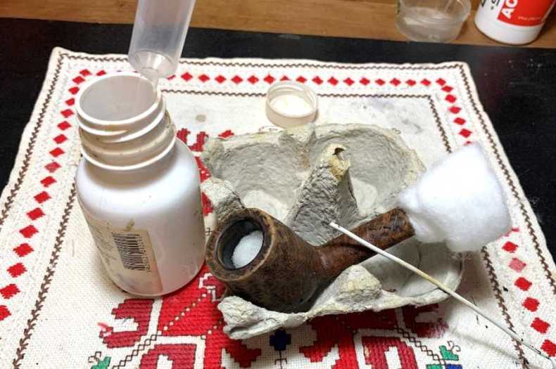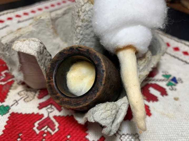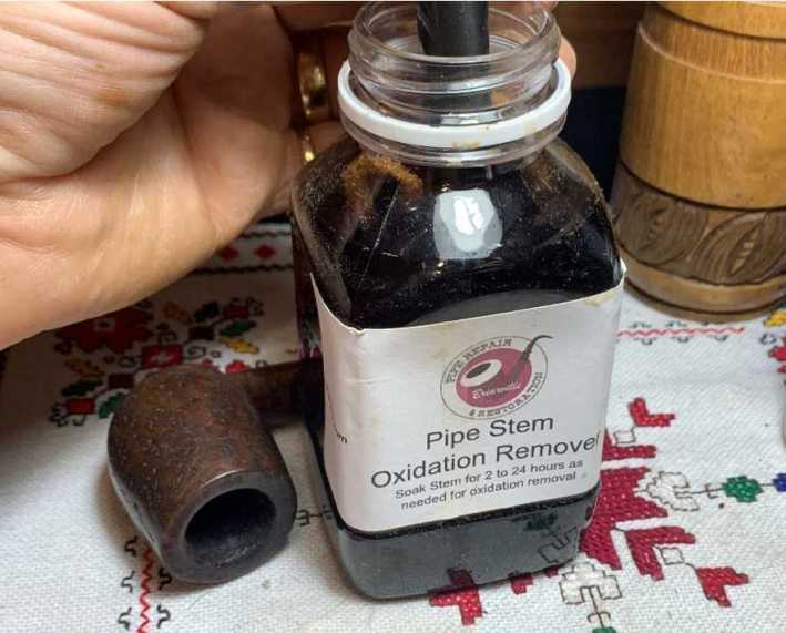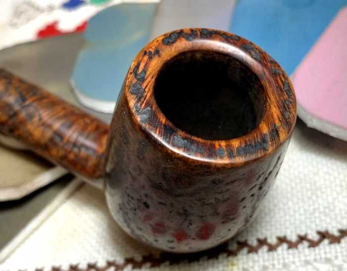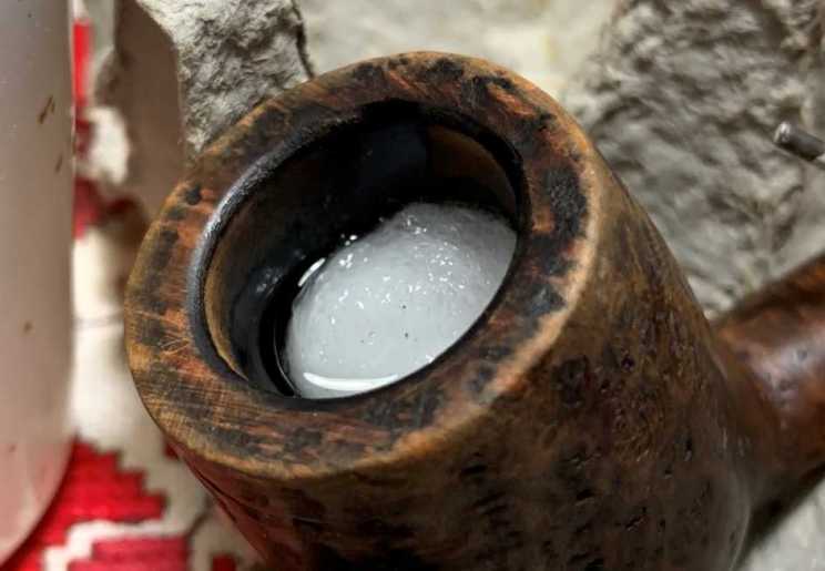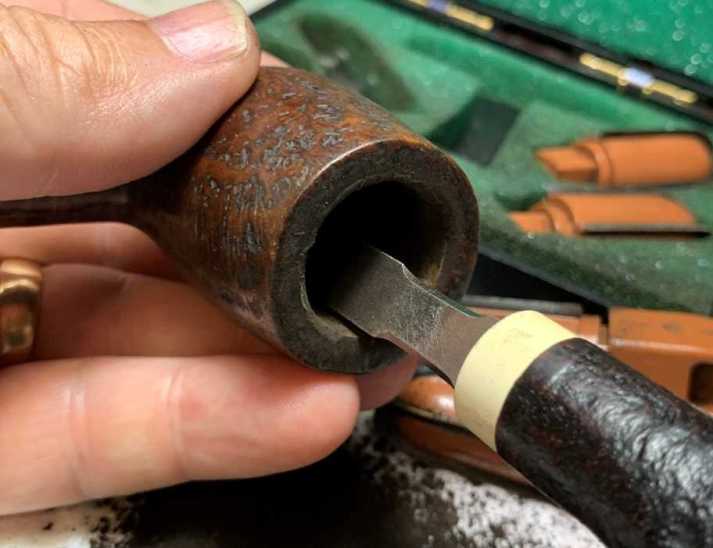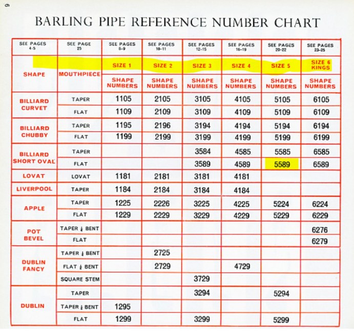 The BB&S Challenger ‘shape number’ reflects this new Barley system.  The first digit represents the size followed by a shape designation.  The ‘Barling Pipe Reference Number Chart’ below was taken from the ‘Retailers Catalogue’ which was also published in 1962, but later in the year.  Note in the chart below, going horizontally (yellow highlight), the sizes are from 1 to 6 representing an increasing size designation (‘1’ was introduced in this later catalogue).    Our pipe’s designation is also highlighted – Size 5 – 589, described as a Billiard Short Oval with a flat mouthpiece.  This description seems spot on for our BB&S Challenger.I love drilling into the provenances of pipes I have the privilege of restoring.  For me, it adds to the value and appreciation of a pipe and this, I hope, is passed on to a new steward who has commissioned a pipe.  With a deeper appreciation of the BB&S on the table, it’s time to look at its condition.  Another look at the chamber and rim reveals moderate cake build up and lava flow over the aft section of the rim.  This should clean up nicely.  The carbon buildup will be removed to allow a fresh start for the briar. The overall appearance of the subtle rusticated briar is that it has darkened from years, grime, and normal use.  I have lightened the pictures some to be able to see more detail.  As the stummel is cleaned, care will be given to avoid the ghosted nomenclature on the flat briar underside.  The last thing I want to do is to contribute to the deterioration.  The stem shows some calcification around the bit and teeth chatter.  There’s a small compression on the upper button lip. To begin the restoration of the early 1960s BB&S Challenger, the stem is the first step.  Using pipe cleaners and isopropyl 99%, the airway is cleaned (forgot picture!).  To address the oxidation and calcification on the stem, the stem is placed in a soak of Briarville’s Pipe Stem Oxidation Remover for several hours. After the soak, the stem is rubbed briskly with a cotton cloth to remove the raised oxidation resulting from the soak.  The airway is cleaned of the fluid with a pipe cleaner and isopropyl 99%. To aid in reconditioning the vulcanite stem, paraffin oil is applied to the stem and rubbed in.  The Briarville soak did an excellent job cleaning the stem.  It’s looking good. Turning now to the stummel, the chamber is reamed using the Pipnet reaming kit. After taking a fresh picture to mark the starting point, starting with the smallest blade the carbon removal is started. Only the next larger blade head is used to clear most of the heavier carbon buildup. The Savinelli Fitsall Tool is used next to continue to scrape the chamber walls.  The Fitsall tool does a good job getting at the sharper angles at the floor of the chamber to clean additional carbon. Lastly, a Sharpie Pen wrapped with 240 paper is used to sand the chamber bringing out the fresh briar more. The full arsenal used to clean the chamber is pictured. After wiping the chamber with a cotton pad a picture shows the cleaned chamber.  An inspection confirms that the chamber wall is in good condition – no heating issues. To continue the basic cleaning phase, undiluted Murphy’s Oil Soap is used to clean the exterior briar.  I noted earlier that the briar was dark and lackluster.  I’m looking forward to seeing what the cleaning will do. Along with scrubbing with a cotton pad, a brass wire brush is used to address the lava flow on the back side of the rim. This quadrant was charred more from lighting practices.  The brass brush adds some abrasion without being overly aggressive with the briar. After the scrubbing, the stummel is transferred to the utility sink where the internals are addressed using shank brushes.  Using hottish water, the internals are scrubbed with anti-oil liquid dish washing soap.  Afterwards, the stummel is thoroughly rinsed and brought back to the worktable.A quick look at the rim reveals the cleaning did a good job.  I also discover that the inner rim edge has a small smart bevel which needs to be refreshed later on.Again, addressing the internals, isopropyl 99% is used with pipe cleaners and cotton buds.  After several plunges using pipe cleaners and cotton buds, a small dental spoon is used to excavate the tars and oils from the mortise. The spoon is used methodically to scrape the inner wall to remove the gunk.  This picture shows a scoop at the beginning of the process.  The more that the gunk can be removed in this way, fewer pipe cleaners and buds will be needed.After a good amount of digging and cleaning, the buds start emerging cleaner and less soiled.  I call a halt to this phase.To continue the cleaning of the internals the stummel is given a cotton ball and isopropyl 99% alcohol soak.  In the past, I have used kosher salt instead of a cotton ball in the chamber to draw out the residual tars and oils and to give the briar a refreshing.  While I never experienced problems with this method, and it is the method of deeper cleaning I use with my personal collection, there has been discussion on different pipe groups that there can be long-term issues resulting from the use of kosher salt (non-iodized).  For this reason, for my restorations, I have used the cotton ball approach which does an adequate job.One cotton ball is inserted into the chamber while the other is used to create a ‘wick’ which helps to draw out the tars and oils.  The cotton ball is stretched and twisted to form the wick.A heavy wire is then used to help guide the wick down through the mortise to the draft hole. Then the alcohol is introduced into the chamber using a large eye dropper.After the isopropyl 99% alcohol surfaces over the cotton, time is given for it to be absorbed into the cotton.  About 10 minutes later the alcohol is topped off.  The stummel is then put aside to soak through the night.  The workday has come to a close 